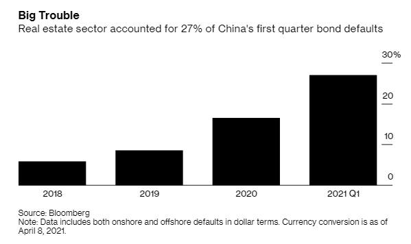 Dữ liệu từ Bloomberg cho thấy các doanh nghiệp bất động sản chiếm hơn ¼ tổng số các vụ vỡ nợ trái phiếu doanh nghiệp của quý 4/2020.