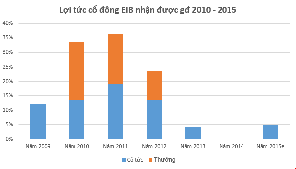 Đến năm 2015, khi mà những khó khăn của EIB đã hiện rõ, cổ đông không nhận cổ tức, ban lãnh đạo EIB cho biết: Lợi nhuận của EIB sụt giảm mạnh do phải trích lập dự phòng rủi ro rất cao mà nguyên nhân sâu xa là các năm trước EIB đã giao thẩm quyền cho các Giám đốc Chi nhánh cao dẫn đến hậu quả nợ xấu cao.