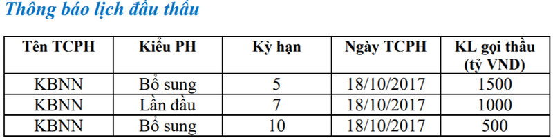 Khối lượng gọi thầu loại kỳ hạn 5 năm ở mức 1.000 tỷ đồng, loại 7 năm, 10 năm và 30 năm ở mức 500 tỷ đồng.