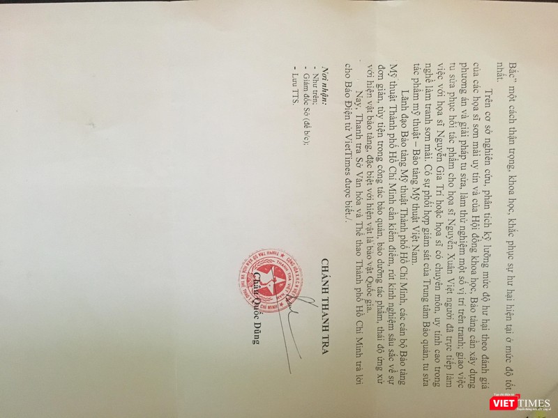 Văn bản nhấn mạnh: “Lãnh đạo Bảo tàng Mỹ thuật TP.HCM, các cán bộ bảo tàng cần kiểm điểm, rút kinh nghiệm sâu sắc về sự đơn giản, tùy tiện trong công việc bảo quản, bảo dưỡng tác phẩm, thái độ ứng xử với hiện vật bảo tàng, đặc biệt với hiện vật là bảo vật quốc gia”.