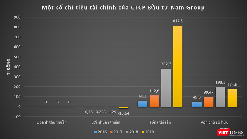 Dữ liệu của VietTimes cho thấy, trong giai đoạn 2016 - 2019, Nam Group (công ty mẹ) không ghi nhận doanh thu, liên tục báo lỗ. Gần nhất, năm 2019, công ty này báo lỗ thuần 16,64 tỉ đồng.