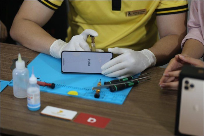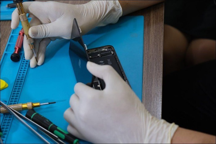 Kỹ thuật viên tháo nắp lưng máy.