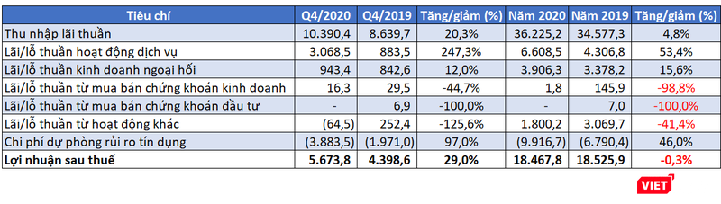 Thu nhập lãi thuần của nhà băng này bứt phá trong quý cuối của năm 2020, đạt mức 10.390 tỉ đồng, tăng 20,3% so với cùng kỳ, đóng góp gần 1/3 tổng thu nhập lãi thuần của cả năm. Dẫu vậy, luỹ kế cả năm 2020, nguồn thu này chỉ tăng trưởng vỏn vẹn 4,8%.