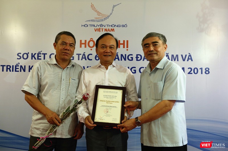 Đại diện Công ty TNHH Phát triển công nghệ Truyền thông Kinh tế số Việt Nam đón nhận chứng nhận hội viên từ Chủ tịch VDCA