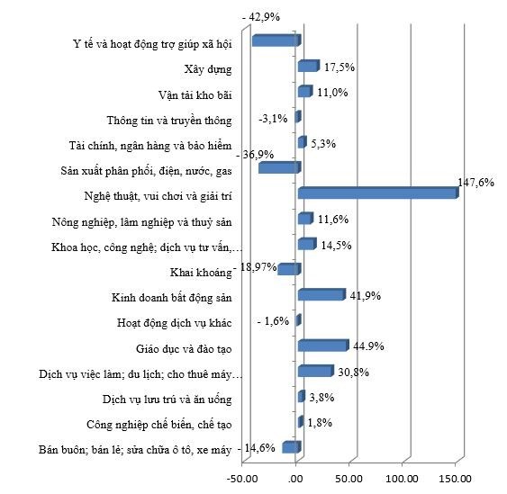 Đáng chú ý, bất động sản là lĩnh vực có số doanh nghiệp thành lập mới tăng cao so với cùng kỳ năm 2014, với mức tăng lên tới 88,8%, cao hơn khá nhiều so với mức tăng của lĩnh vực tài chính ngân hàng và bảo hiểm (mức 55,4%).