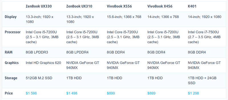 Trong số các sản phẩm mới sắp ra mắt này, đáng chú ý nhất chính còn có mẫu K401 vốn trang bị bộ xử lý Intel Core i7-7500U, màn hình 14 inch Full HD, RAM DDR4 8GB, đồ họa rời GeForce GT 940M, ổ cứng 1TB kèm ổ SSD 24GB và có giá bán chỉ 1.298 USD. Dòng sản phẩm Asus ZenBook cũng sẽ có 2 bản nâng cấp mới là UX330 và UX310 với thiết kế màn hình 13,3 inch Full HD, bộ xử lý Intel Core i5-7200U, tùy chọn RAM DDR3 hoặc DDR4.