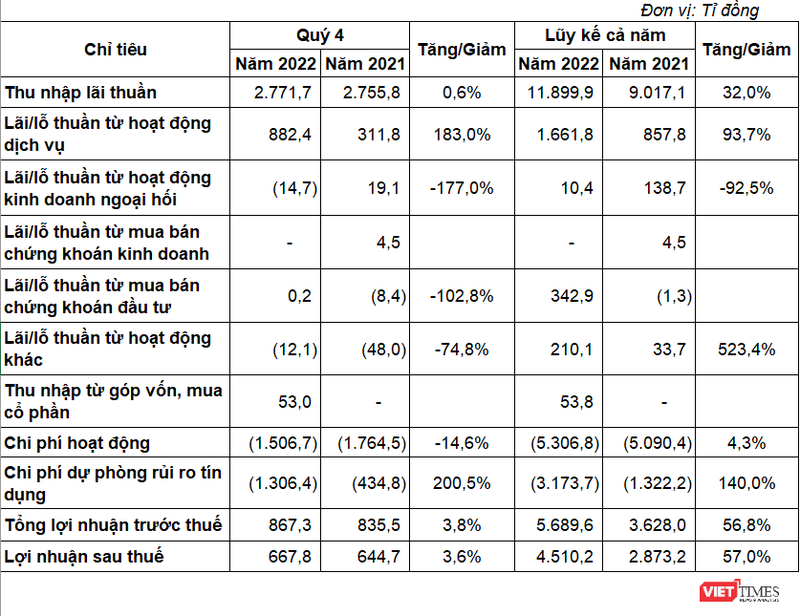 Tuy nhiên, trong quý 4/2022, LPB đã tăng chi phí dự phòng rủi ro tín dụng lên gấp 3 lần, ở mức 1.306,4 tỉ đồng. Điều này khiến LPB chỉ ghi nhận 867,3 tỉ đồng lãi trước thuế trong quý 4/2022, tăng 3,8% so với cùng kỳ.