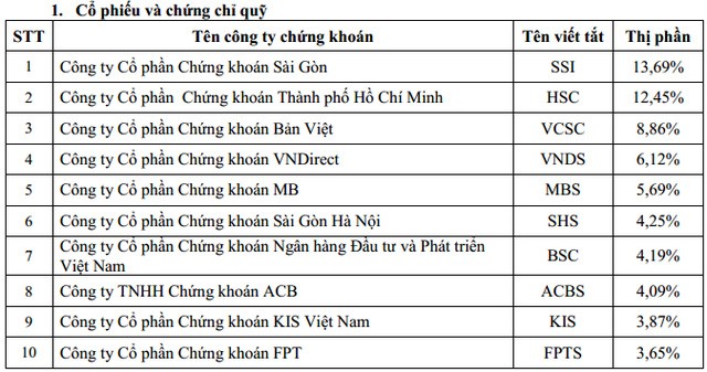 Trong khi đó, CTCP Chứng khoán Bảo Việt (BVSC) cùng với Chứng khoán FPT (FPTS) đã thay thế CTCP Chứng khoán KIS Việt Nam (KIS) và CTCP Chứng khoán Ngân hàng Ngoại thương Việt Nam (VCBS) để lọt vào top 10 thị phần môi giới cổ phiếu và chứng chỉ quỹ.