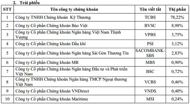 Về thị phần môi giới trái phiếu năm 2016, không bất ngờ khi TCBS giữ vững vị trí số 1 với thị phần áp đảo 78,22%, bỏ xa đối thủ đứng thứ 2 là BVSC với thị phần 8,98%. Kế đến là VPBS (3,75%), PSI (3,12%), Sacombank – SBS (2,83%).