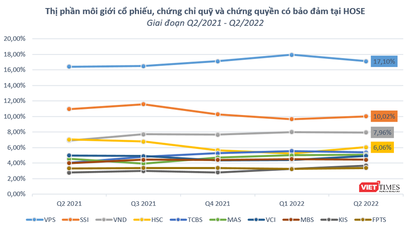Thống kê mới nhất của HoSE cho thấy, CTCP Chứng khoán VPS (VPS) vẫn giữ vững ngôi đầu về thị phần môi giới cổ phiếu, chứng chỉ quỹ và chứng quyền có bảo đảm, chiếm 17,1% thị phần, giảm nhẹ so với mức 17,94% trong quý 1/2022.