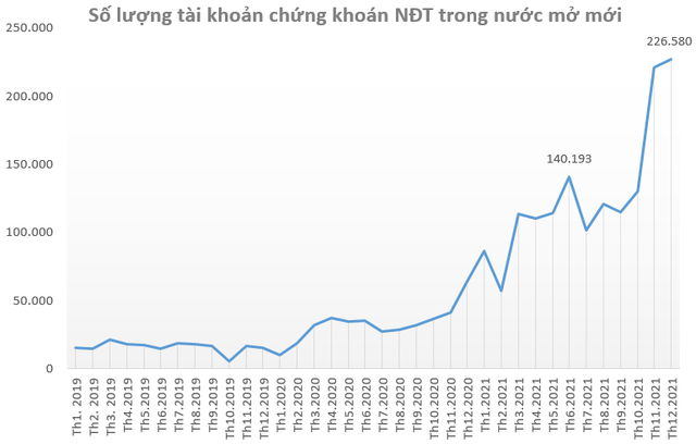 Lượng tài khoản nhà đầu tư trong nước mở mới trong tháng 12 vừa qua là con số lớn nhất trong lịch sử 21 năm thành lập thị trường. Đây cũng là tháng thứ 10 liên tiếp số tài khoản mở mới của nhà đầu tư trong nước duy trì ở mức trên 100.000 mỗi tháng và là tháng thứ 2 liên tiếp có trên 200.000 tài khoản được mở mới.