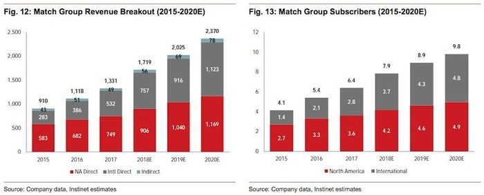 "Khoảng 20% trong tổng số 1/2 người dùng internet - tương đương với 310 triệu người trên toàn cầu (trừ Trung Quốc) sẽ sử dụng các sản phẩm hẹn hò trực tuyến vào năm 2020 (tăng 15% kể từ năm 2015). Chúng tôi tin rằng Match Group vẫn dẫn đầu ở thị trường hẹn hò trong tương lai gần, khi mà Tinder vẫn tiếp tục tăng trưởng và các thương hiệu còn lại như Hinge vẫn phát triển không ngừng trên diện rộng".
