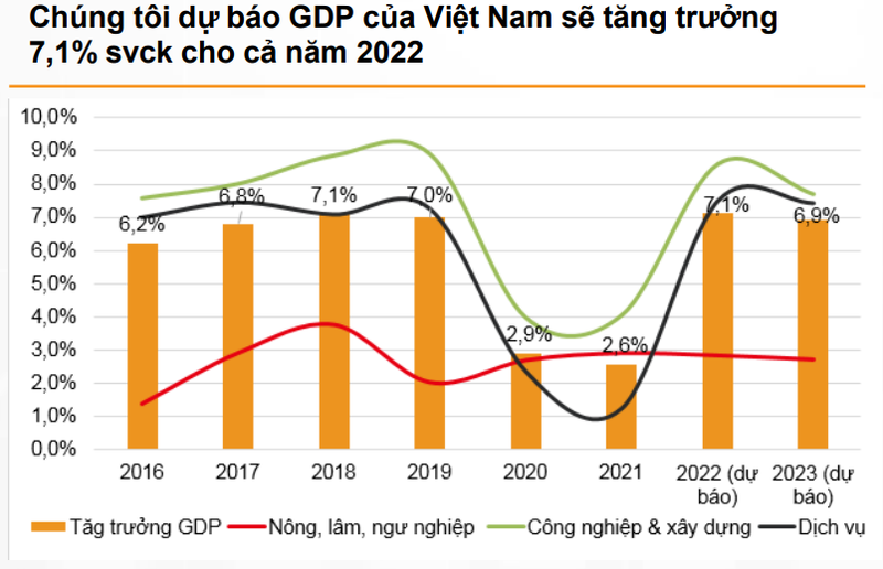 Nhóm phân tích giữ nguyên dự báo tăng trưởng GDP của Việt Nam năm 2022 là 7,1%. Tuy nhiên, nền kinh tế có thể đối mặt với những rủi ro tiềm ẩn trong những quý tới như: tăng trưởng xuất khẩu chậm lại do nhu cầu bên ngoài giảm, áp lực lạm phát tăng cao dịp cuối năm, lãi suất tăng.