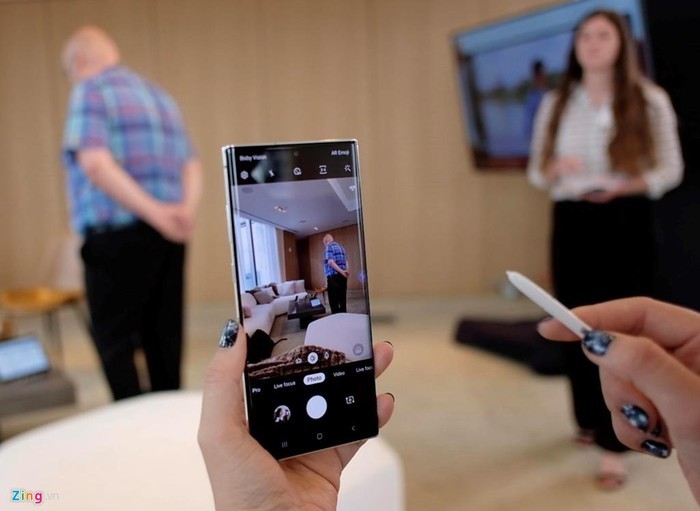 Bên cạnh đó, bút S Pen trên Galaxy Note10 được trang bị thêm tính năng điều khiển bằng cử chỉ từ xa. Tôi có thể hướng đầu bút vào màn hình và "vẩy" bút sang bên trái/phải để chuyển đổi các chế độ chụp, lên/xuống để chuyển sang camera selfie và xoay tròn để zoom.