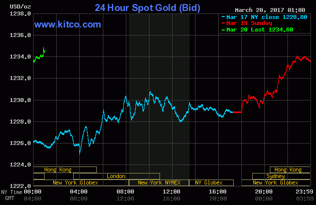 Cùng lúc, tại thị trường châu Á, giá vàng miếng giao ngay trên sàn Kitco cũng được yết ở $1.234,60/oz.