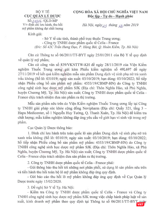 Vì thế, Cục Quản lý Dược thông báo đình chỉ lưu hành toàn quốc lô sản phẩm dung dịch vệ sinh phụ nữ trà xanh trầu không do Công ty TNHH Công Nghệ Sinh Học Dược Mỹ Phẩm SJK (địa chỉ: Thôn Nghĩa Hảo, xã Phú Nghĩa, huyện Chương Mỹ, TP. Hà Nội) sản xuất, Công ty TNHH Dược Phẩm Quốc Tế Celia – France chịu trách nhiệm đưa sản phẩm ra thị trường.