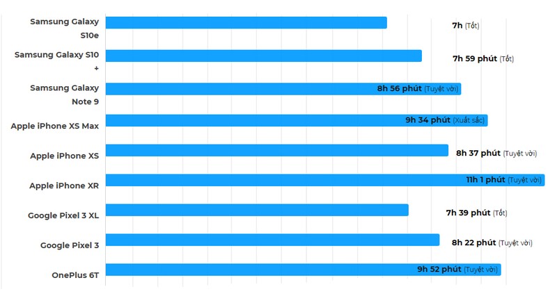 Thử nghiệm cho thấy Galaxy S10e chỉ có thời lượng pin ở mức Khá. Dưới đây là bảng so sánh thời lượng pin của Galaxy S10e với một số smartphone khác của Phone Arena