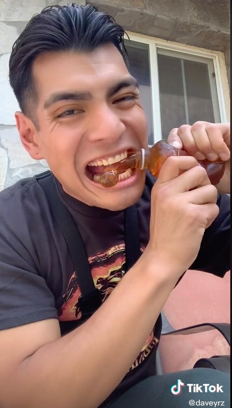 Đầu tháng 7, một TikToker có tên Dave Ramirez lần đầu tải lên clip ngắn, ghi lại cảnh mình dùng hai tay bóp chặt một chai đông lạnh. Thứ nước mật ong màu vàng óng chảy ra và Dave đưa vào miệng thưởng thức.