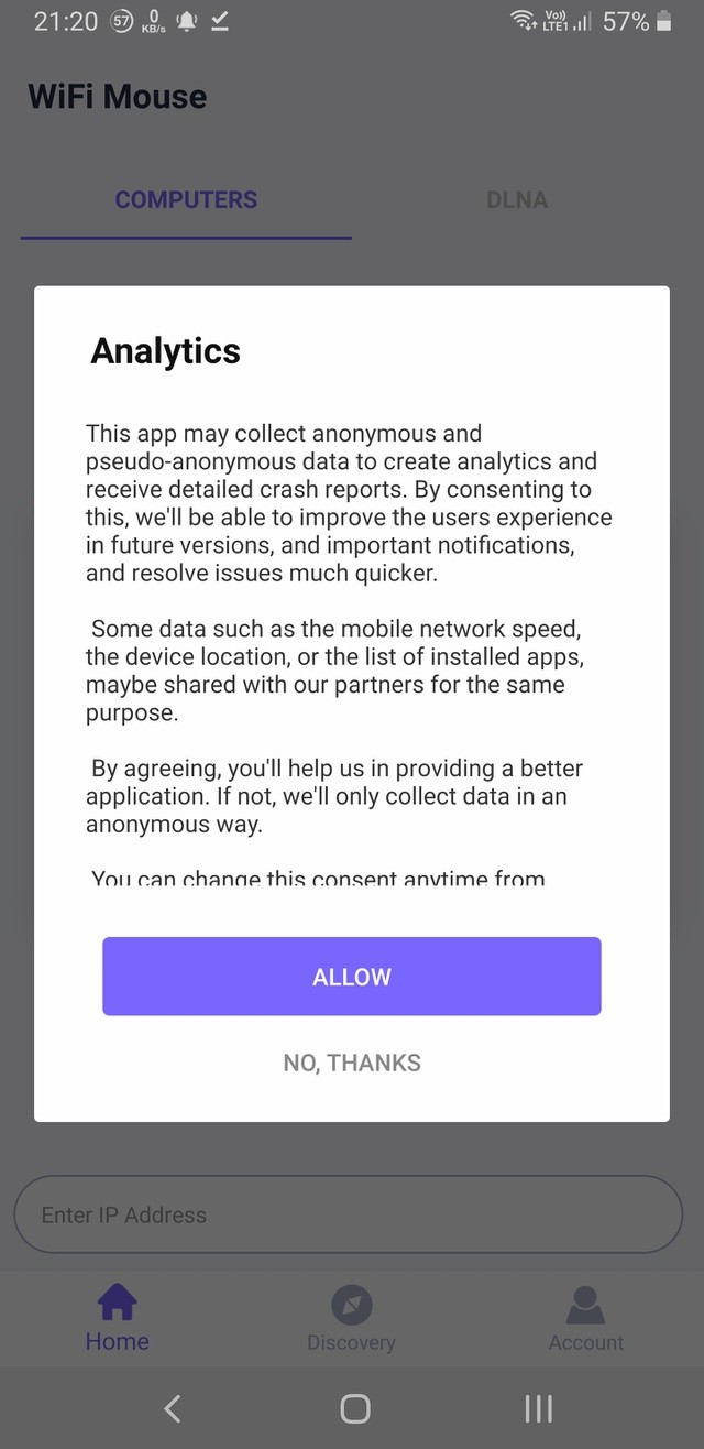 Tại giao diện đầu tiên hiện ra sau khi chạy ứng dụng, một hộp thoại sẽ xin phép người dùng thu thập tình trạng hoạt động của ứng dụng Wifi Mouse để ghi nhận những lần ứng dụng bị lỗi, giúp cải thiện chất lượng ứng dụng. Bạn có thể nhấn nút “No, Thanks” để bỏ qua yêu cầu này.