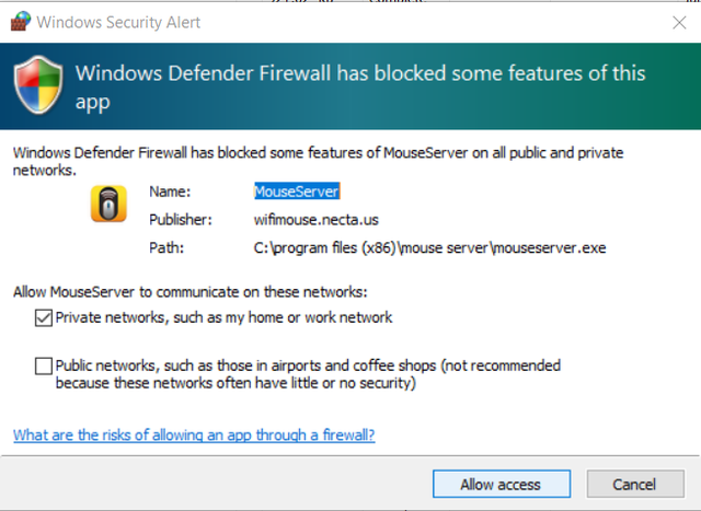Lưu ý: sau khi cài đặt và chạy phần mềm Wifi Mouse Server, nếu xuất hiện hộp thoại tường lửa của Windows hỏi người dùng có muốn cho phép phần mềm kết nối Internet hay không, bạn nhấn vào “Allow access” để cấp phép.
