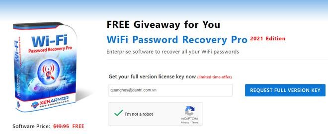 - Tiếp theo, truy cập vào trang web khuyến mãi của XenArmor https://xenarmor.com/wifipasswordrecoverypro-free-full-version-software/ ,điền địa chỉ email vào khung trống, đánh dấu vào tùy chọn "I'm not a robot" rồi nhấn nút "Request full version key".