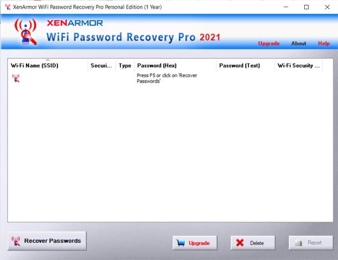 Cách thức sử dụng XenArmor WiFi Password Recovery Pro rất đơn giản. Từ giao diện chính của phần mềm, bạn nhấn vào nút "Recover Passwords" hoặc nhấn nút F5 trên bàn phím, lập tức danh sách những mạng Wi-Fi mà máy tính đã từng kết nối từ trước đến nay sẽ được liệt kê một cách đầy đủ, kèm theo đó là mật khẩu của các mạng Wi-Fi này.