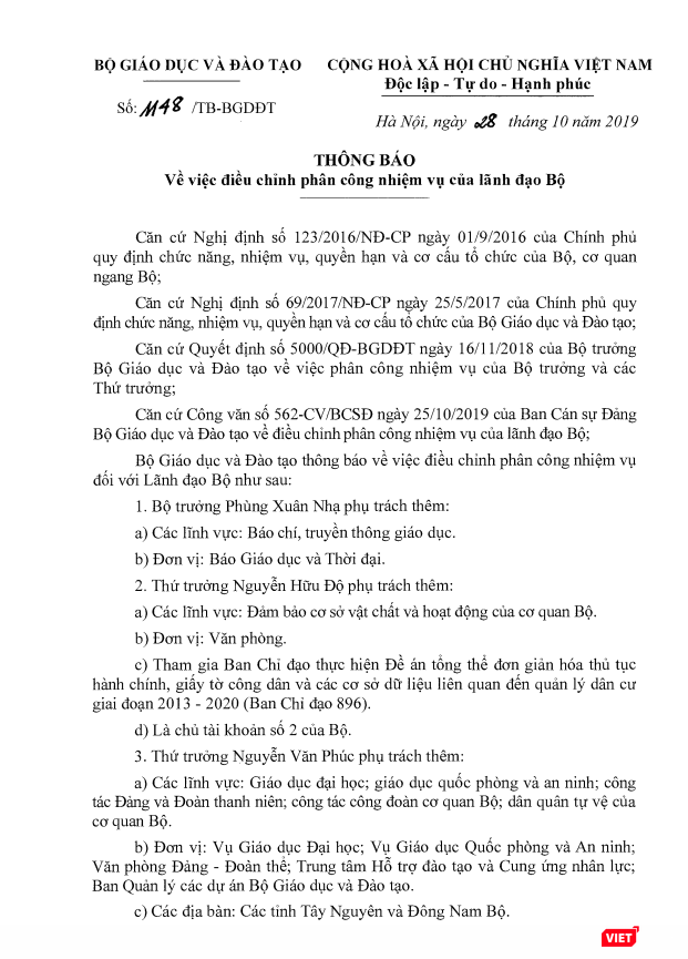 Cũng theo thông báo của Bộ GD&ĐT, Bộ trưởng Bộ GD&ĐT Phùng Xuân Nhạ sẽ phụ trách thêm các lĩnh vực báo chí, truyền thông giáo dục, Báo Giáo dục và Thời đại.