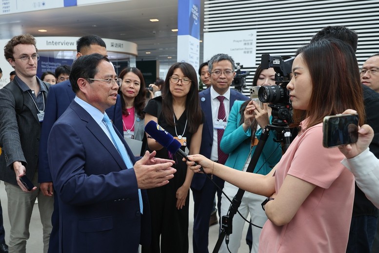 Thủ tướng trả lời phỏng vấn phóng viên quốc tế sau phiên đối thoại - Ảnh: VGP/Nhật Bắc