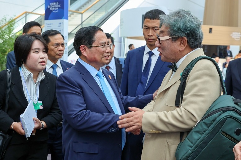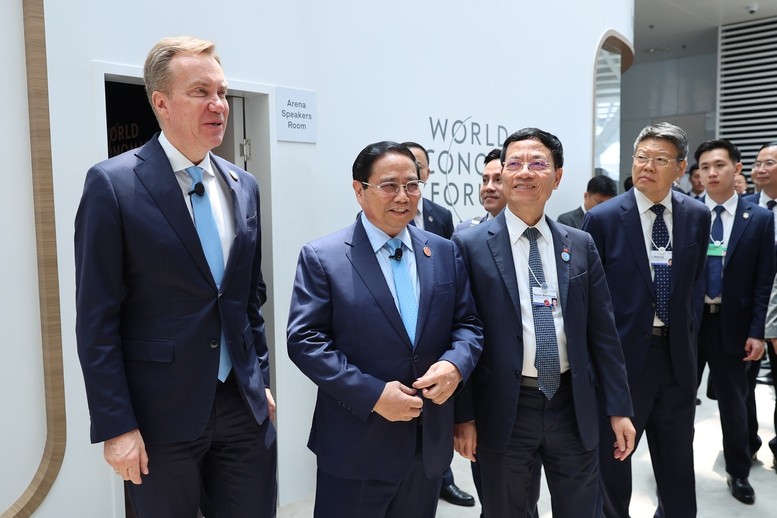 Thủ tướng Phạm Minh Chính và Chủ tịch điều hành WEF Borge Brende trao đổi trước khi dự phiên đối thoại chính sách "Kỷ nguyên mới của Việt Nam: Từ tầm nhìn đến hành động" - Ảnh: VGP/Nhật Bắc