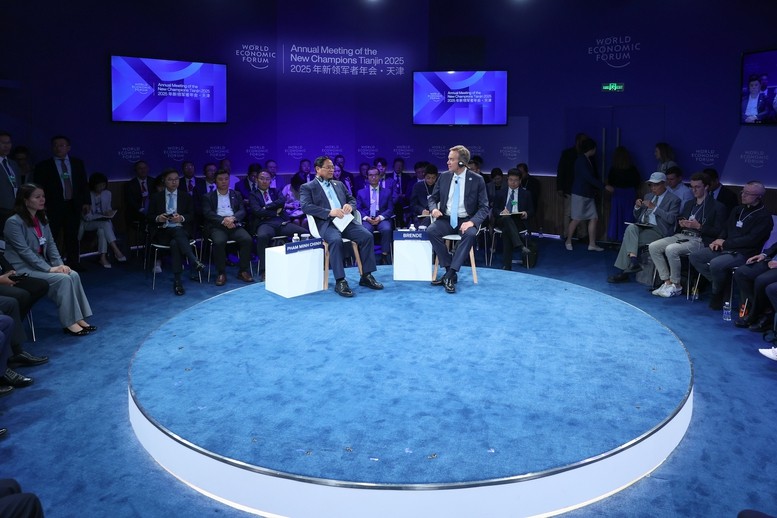 Thủ tướng Phạm Minh Chính và Chủ tịch điều hành WEF Borge Brende dự phiên đối thoại chính sách "Kỷ nguyên mới của Việt Nam: Từ tầm nhìn đến hành động" - Ảnh: VGP/Nhật Bắc