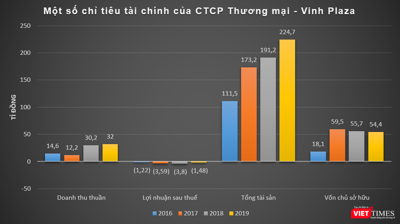 Dữ liệu của VietTimes cho thấy, trong giai đoạn 2016 - 2019, Vinh Plaza liên tục báo lỗ với lỗ sau thuế lũy kế 4 năm lên tới cả chục tỉ đồng. Cụ thể, năm 2016 và 2017, công ty này ghi nhận doanh thu thuần đạt lần lượt 14,6 tỉ đồng và 12,2 tỉ đồng, báo lỗ sau thuế lần lượt ở mức 1,22 tỉ đồng và 3,59 tỉ đồng.