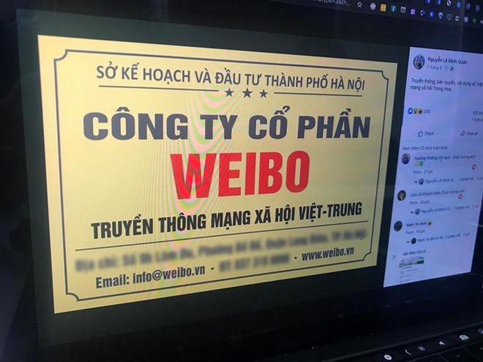 Trên mạng xã hội, nhiều người chia sẻ hình ảnh một biển hiệu công ty có tên "Công ty cổ phần Weibo", với mô tả là "Truyền thông mạng xã hội Việt - Trung". Ngoài ra, theo thông tin thì công ty này còn sở hữu tên miền weibo.vn.