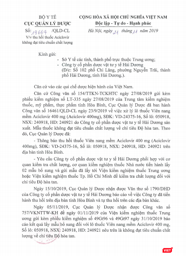Trước đó, căn cứ công văn gửi kèm Phiếu kiểm nghiệm thuốc của Trung tâm kiểm nghiệm thuốc, mỹ phẩm, thực phẩm tỉnh Hòa Bình, ngày 23/9, Cục Quản lý Dược đã ban hành văn bản xử lý lô thuốc viên nang mềm Aciclovir 400mg, SĐK: VD-24375-16, Số lô: 050918, NSX: 24/9/2018, HD: 24/9/2021 do Công ty Cổ phần Dược vật tư y tế Hải Dương sản xuất.