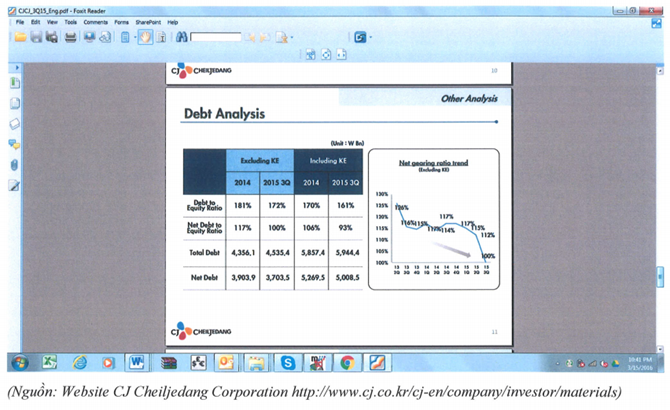 Tuy nhiên Proconco cho biết, theo thông tin trên website của chính CJ thì doanh nghiệp này đang có chỉ số Tổng nợ phải trả/Vốn chủ sở hữu tại thời điểm 30/9/2015 là 1,61 lần, vượt quá tiêu chí.