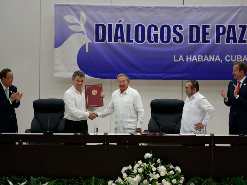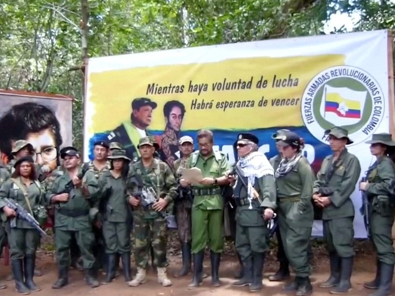 FARC là một trong những tổ chức chống chính phủ cánh tả đã đối đầu chính phủ Colombia trong hơn 40 năm, từng bị Mỹ và Liên minh châu Âu liệt vào danh sách các tổ chức khủng bố. Với nỗ lực hòa giải của quốc tế, vào tháng 6 năm 2016, FARC và chính phủ Colombia đã ký một thỏa thuận ngừng bắn và ký Hiệp định hòa bình vào tháng 11 cùng năm. Ảnh dưới: ngày 23/6/2016, sau khi Tổng thống Colombia Juan Manuel Santos (thứ hai từ trái sang) và lãnh đạo FARC Rodrigo Londono (thứ hai từ phải sang) ký thỏa thuận ngừng bắn cuối cùng ở Havana, Cuba, Tổng thống Santos và lãnh đạo Cuba Raul Castro (giữa) bắt tay nhau.