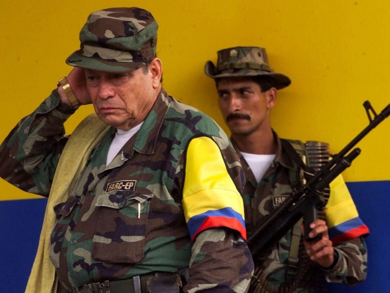 Được thành lập vào năm 1964, FARC từng là lực lượng vũ trang chống chính phủ lớn nhất và có tổ chức chặt chẽ nhất ở Colombia. Cuộc xung đột với các lực lượng chính phủ trong nửa thế kỷ đã giết chết hơn 200.000 người và hàng triệu người bỏ nhà ra đi. Ảnh dưới: ngày 29/4/2000, Manuel Marulanda (trước) người sáng lập và chỉ huy tối cao của FARC đến San Vicente del Caguan (thị trấn miền nam Colombia) thuộc vùng kiểm soát của FARC và tham gia “Nghi thức của phong trào Boliva”.