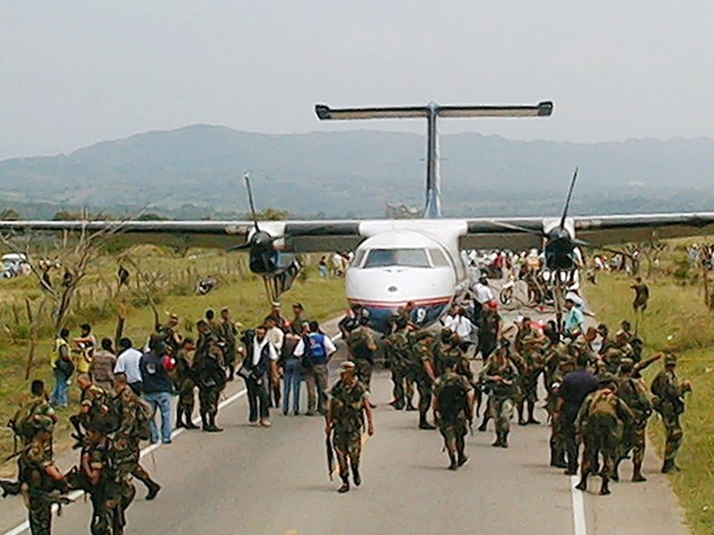 Từ năm 2012, chính phủ Colombia và FARC bắt đầu tiến hành đàm phán hòa bình. Ngày 24/11/2016, Tổng thống Colombia Santos và thủ lĩnh FARC Rodrigo Londono bắt tay nhau tuyên bố trước thế giới chấm dứt cuộc nội chiến đẫm máu kéo dài tới 52 năm. Ảnh dưới: ngày 20/2/2002, những người lính vây quanh một chiếc máy bay bị cướp bởi FARC, buộc phải hạ cánh xuống một vùng nông thôn gần Hobo thuộc tỉnh Naiva, miền nam Colombia.