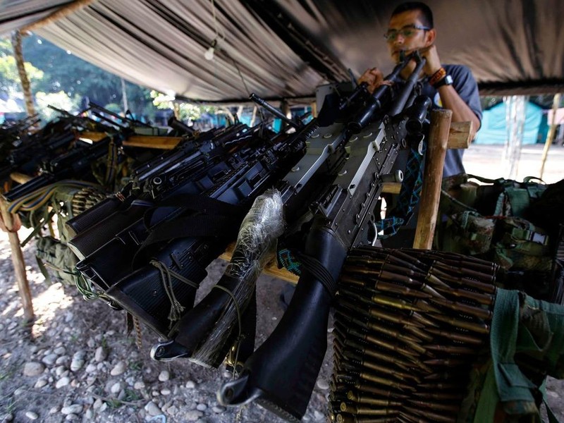 Sau khi ký hiệp định hòa bình cuối cùng, khoảng 7.000 lính chiến đấu của FARC đã ra khỏi rừng và trao vũ khí cho các quan sát viên của Liên Hợp Quốc. Tuy nhiên, một số ít du kích đã gia nhập các nhóm buôn bán ma túy và tình hình ở Colombia vẫn bất ổn, khiến nhiều người dân thấy thất vọng. Ảnh dưới: ngày 28/2/2017, vũ khí của FARC được cất giữ tại doanh trại La Carmelita gần cảng Ashi, Putumayo, tây nam Colombia.