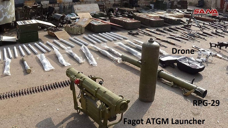 Kho vũ khí trong hầm ngầm chứa một tên lửa chống tăng có điều khiển Fagot (ATGM) do Bulgaria chế tạo cùng 2 tên lửa, một tên lửa chống tăng HJ-8 Red Arrow ATGM do Trung Quốc sản xuất, một súng phóng lựu chống tăng RPG-29 thuộc Liên Xô cũ cùng với một số đạn, một đạn rocket Sakr 122mm do Ai Cập sản xuất và một máy bay không người lái mini.