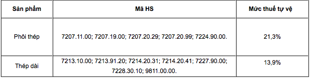 Các sản phẩm phôi thép và thép dài được loại trừ khỏi phạm vi áp dụng biện pháp tự vệ. Tại Mục 3, thông báo kèm theo Quyết định số 2968/QĐ-BCT nêu trên, mức thuế tự vệ đối với phôi thép là 23,3% và thép dài là 15,4% sẽ kết thúc vào ngày 21/3/2017.