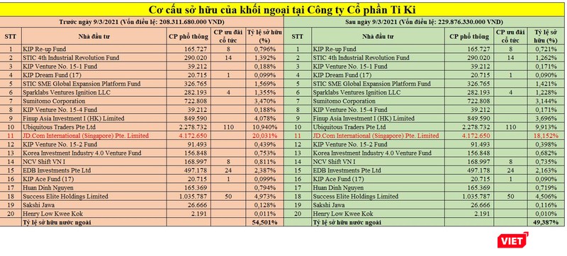 Các cổ đông nước ngoài dường như đã không tham gia vào đợt tăng vốn này, khiến tỉ lệ sở hữu của khối ngoại tại Tiki giảm xuống còn 49,387% vốn điều lệ.