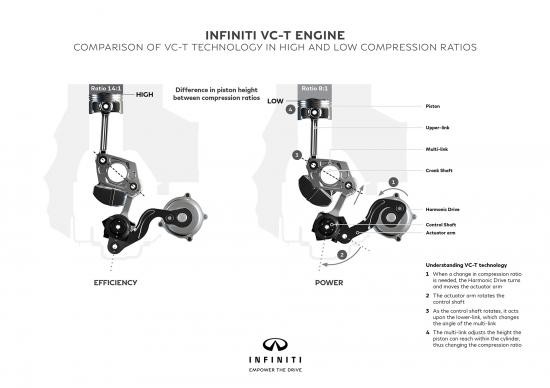 Động cơ VC-T sẽ có tỉ số nén biến thiên từ 8:1 đến 14:1, được điều khiển điện tử. Khi phát hiện ra xe cần nhiều công suất hơn khi cần tải nặng, động cơ sẽ hoạt động ở mức tỉ số nén thấp, nhằm mang lại công suất tối đa, đồng thời cải thiện tình trạng kích nổ sớm trên các động cơ tăng áp.