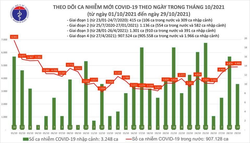 Tính từ 16h ngày 28/10 đến 16h ngày 29/10, trên Hệ thống Quốc gia quản lý ca bệnh COVID-19 ghi nhận 4.899 ca nhiễm mới, trong đó 10 ca nhập cảnh và 4.889 ca ghi nhận trong nước (tăng 13 ca so với ngày trước đó) tại 50 tỉnh, thành phố (có 2.305 ca trong cộng đồng).