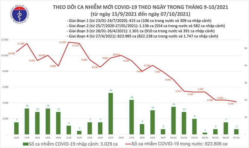 Tính từ 17h ngày 06/10 đến 17h ngày 07/10, trên Hệ thống Quốc gia quản lý ca bệnh COVID-19 ghi nhận 4.150 ca nhiễm mới, trong đó 03 ca nhập cảnh và 4.147 ca ghi nhận trong nước (giảm 209 ca so với ngày trước đó) tại 43 tỉnh, thành phố (có 1.986 ca trong cộng đồng).