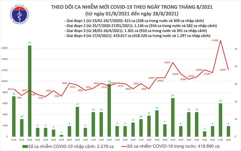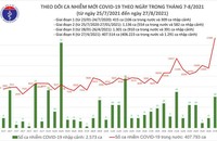 Ngày 27/8 có 304.176 liều vắc xin phòng COVID-19 được tiêm. Như vậy, tổng số liều vắc xin đã được tiêm là 19.151.122 liều, trong đó tiêm 1 mũi là 16.822.691 liều, tiêm mũi 2 là 2.328.431 liều.