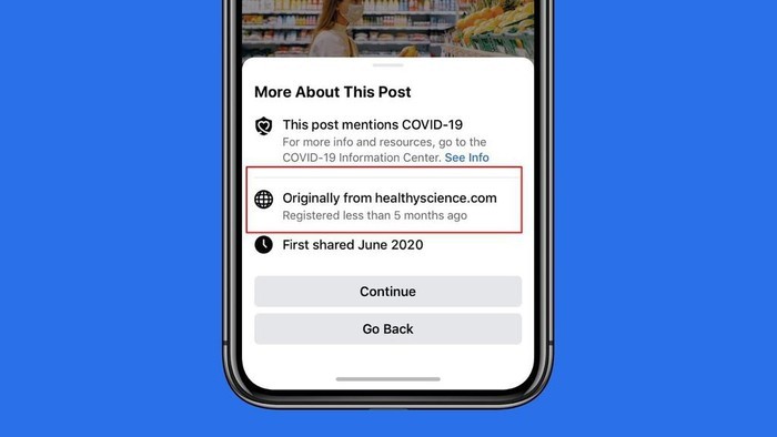 Tới tháng 8, Facebook mới cập nhật tính năng hiển thị "nguồn tin tức đầu tiên" của bài đăng có nội dung liên quan tới Covid-19. Ảnh: Facebook.