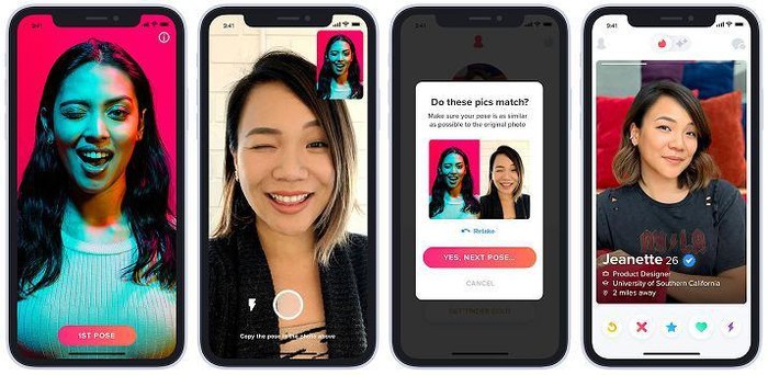 Tính năng Xác minh qua ảnh của Tinder giúp đảm bảo tính xác thực của đối tượng tương hợp, cho phép các thành viên tự xác thực tài khoản của mình bằng một loạt ảnh chụp khuôn mặt ngay tại thời điểm thực tại và so sánh với ảnh đại diện bằng công nghê AI. Các hồ sơ đã được xác thực sẽ có dấu tích xanh bên cạnh.