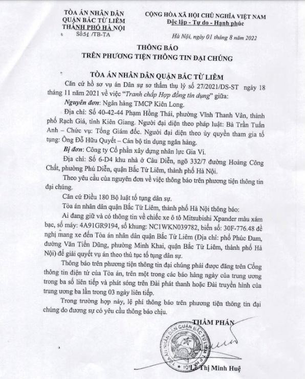 Ai đang giữ và có thông tin về chiếc xe ô tô Mitsubishi Xpander màu xám bạc, số máy: 4A91GR9194, số khung: NC1WWKN039782, biển số: 30F-776.48 đề nghị mang xe đến Tòa án nhân dân quận Bắc Từ Liêm (Địa chỉ: phố Phúc Đam, đường Văn Tiến Dũng, phường Minh Khai, quận Bắc Từ Liêm, thành phố Hà Nội) để giải quyết vụ án theo thủ tục tố tụng dân sự.