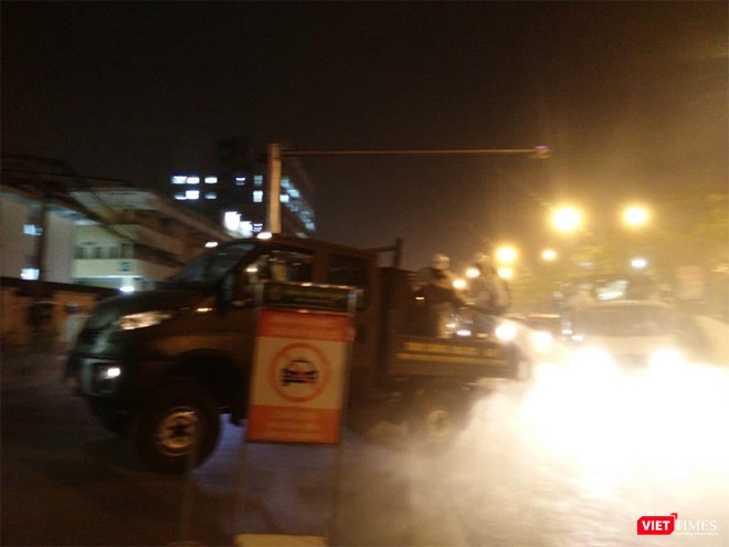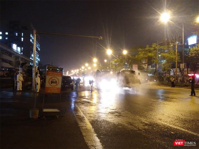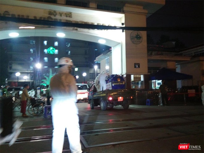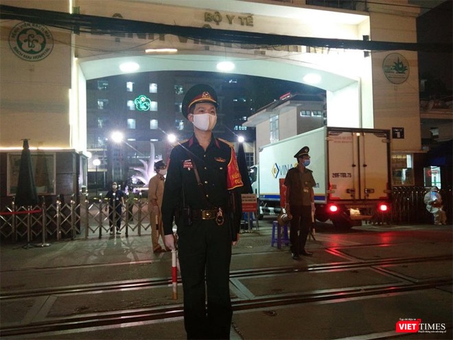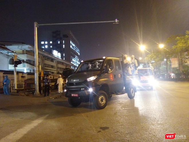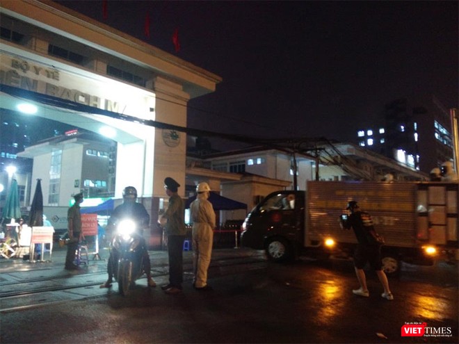 Đúng 19h đoàn xe của Binh chủng Hóa học đi từ hướng đường Giải Phóng vào cổng chính Bệnh viện Bạch Mai làm nhiệm vụ trong sự bảo vệ và hướng dẫn giao thông nghiêm ngặt của Công an quận Hai Bà Trưng, Hà Nội.