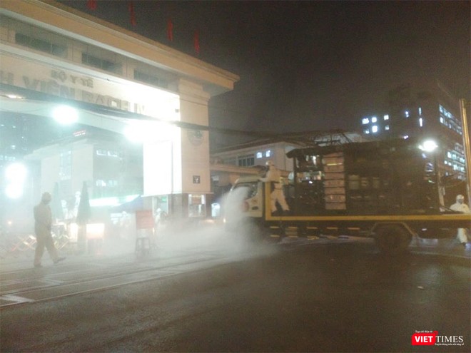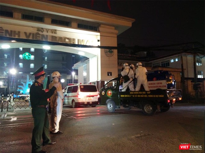VietTimes -- Bắt đầu từ 19h tối nay (28/3), Binh chủng Hóa học (Bộ Quốc phòng) đã cử lực lượng đến phun tiêu độc toàn bộ không gian của Bệnh viện Bạch Mai (Hà Nội). Gần 70 cán bộ chiến sĩ của Binh chủng tiến hành tiêu độc toàn bộ không gian trước, trong và phía sau của Bệnh viện gồm đường đi nội bộ, hành lang, ban công…